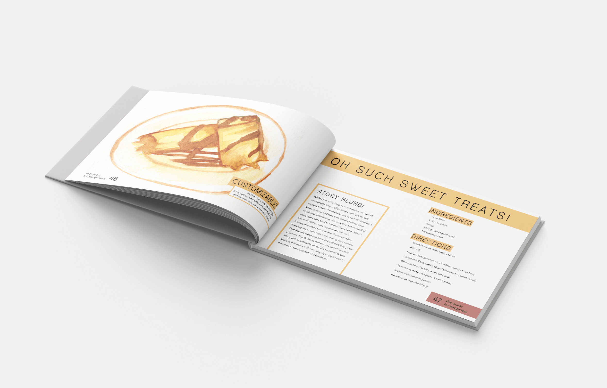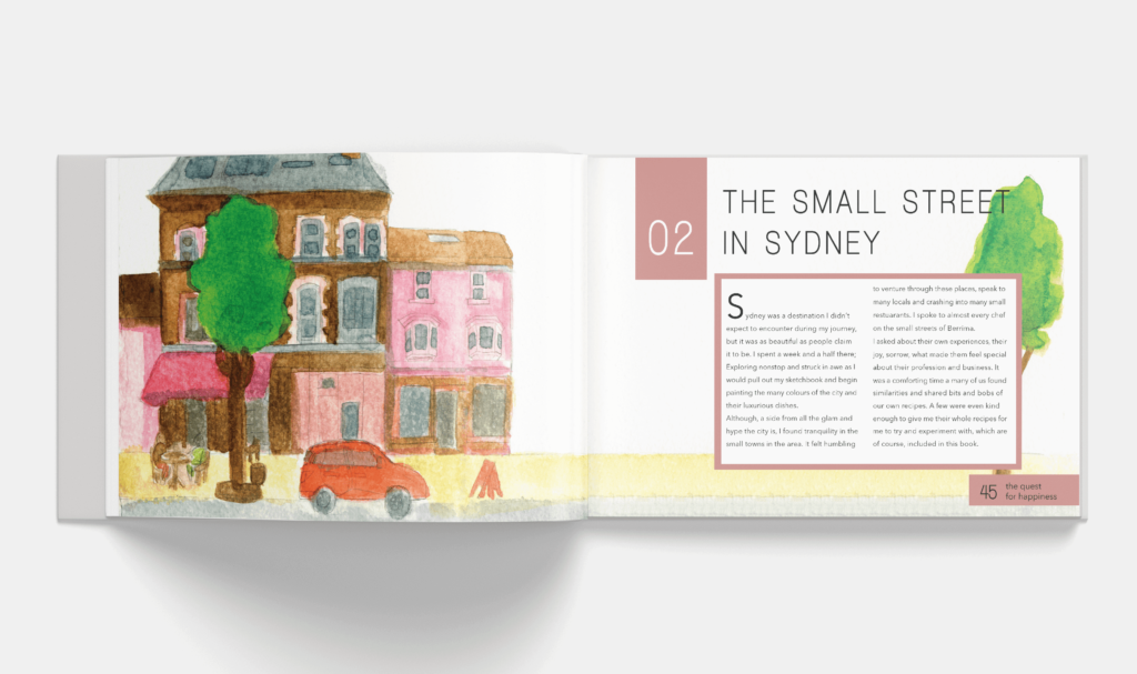 A fictional Cookbook for an author in search of happiness through food. Food from his travels, food that left an impression on him and his own passion for cooking, adding his own twists to these delicacies he enjoyed all around the world, into one cookbook. The fictional author, Oscar, was also an artistic soul, enjoying watercolour painting, hence the watercolour illustrations in his cookbook.